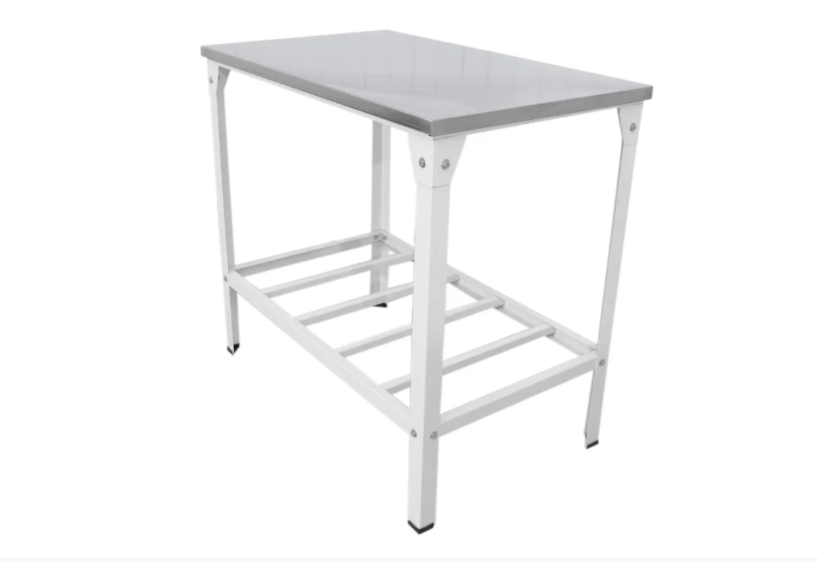 A mesa com tampo em inox facilita a higienização e a durabilidade. A estrutura é feita de aço galvanizado e possui pintura eletrostática com ótimo acabamento e design.